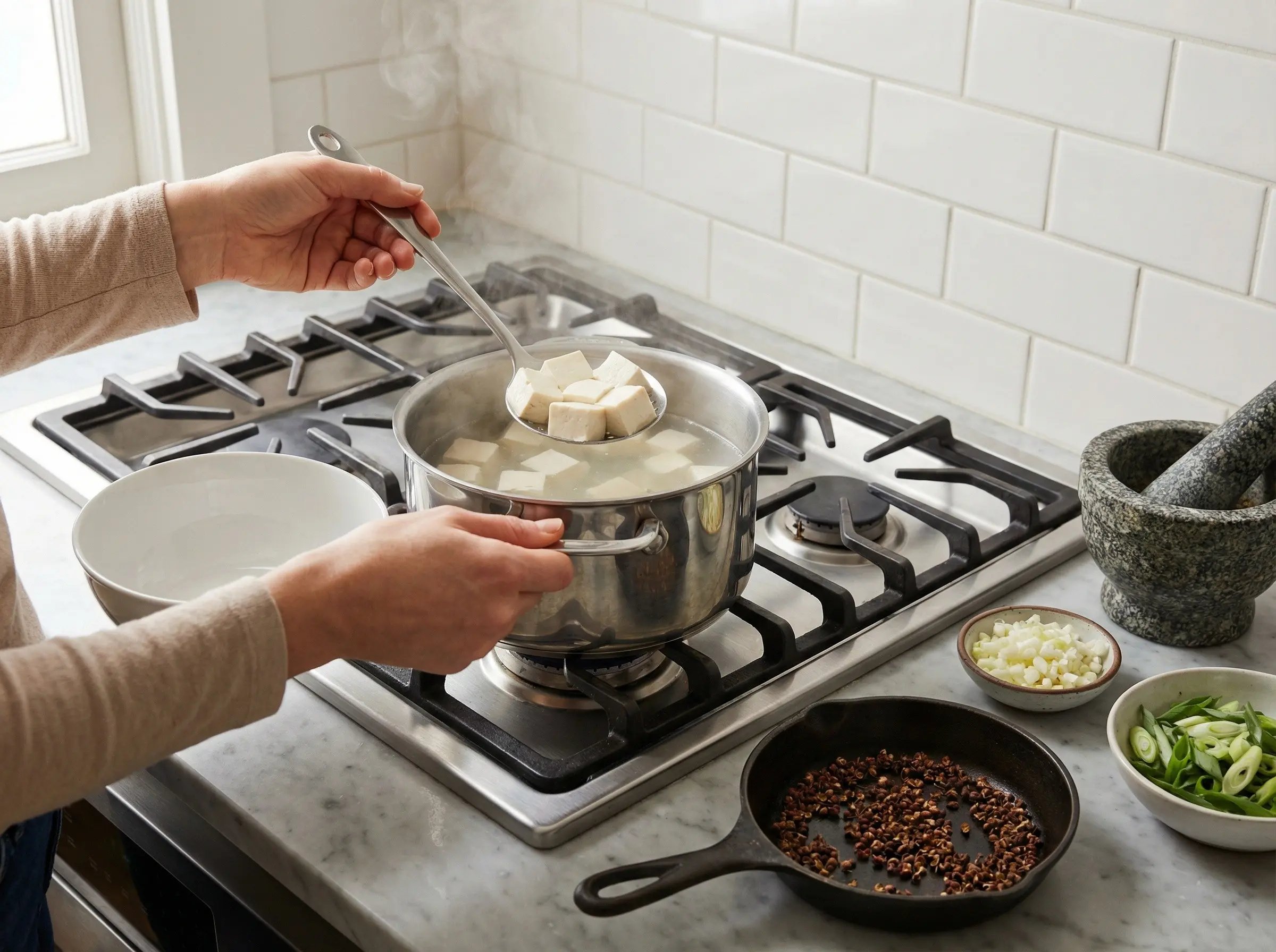 Prepare all ingredients before you start cooking - mapo tofu comes together very quickly. Cut the tofu into 1-inch cubes and gently slide them into a pot of salted simmering water. Let the tofu poach for 2-3 minutes - this firms it slightly so it holds its shape better during cooking and removes any raw bean taste. Carefully drain and set aside. Toast the whole Sichuan peppercorns in a dry skillet over medium heat for 1-2 minutes until fragrant and slightly darkened. Grind them in a spice grinder or mortar and pestle. Separate the green onions into white parts (minced) and green parts (sliced for garnish).