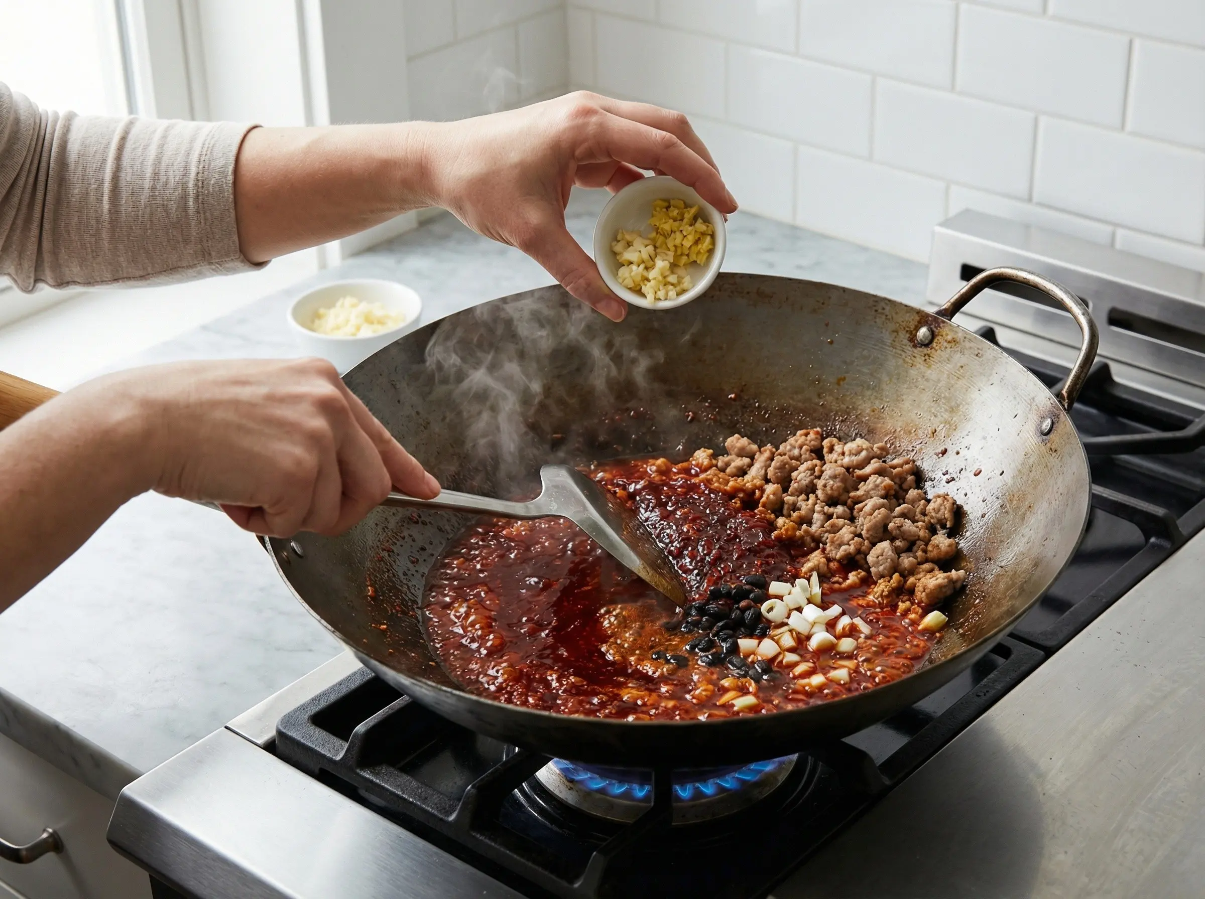 Reduce the heat to medium and add the doubanjiang (chili bean paste) to the oil in the wok. Stir and fry for about 1 minute until the oil turns red and the paste becomes very fragrant - this is called "stir-frying the color" and is essential for developing the deep, complex flavor of the dish. Be careful not to burn the paste. Add the fermented black beans, minced garlic, minced ginger, and white parts of the green onions. Stir-fry for another 30 seconds until very aromatic.