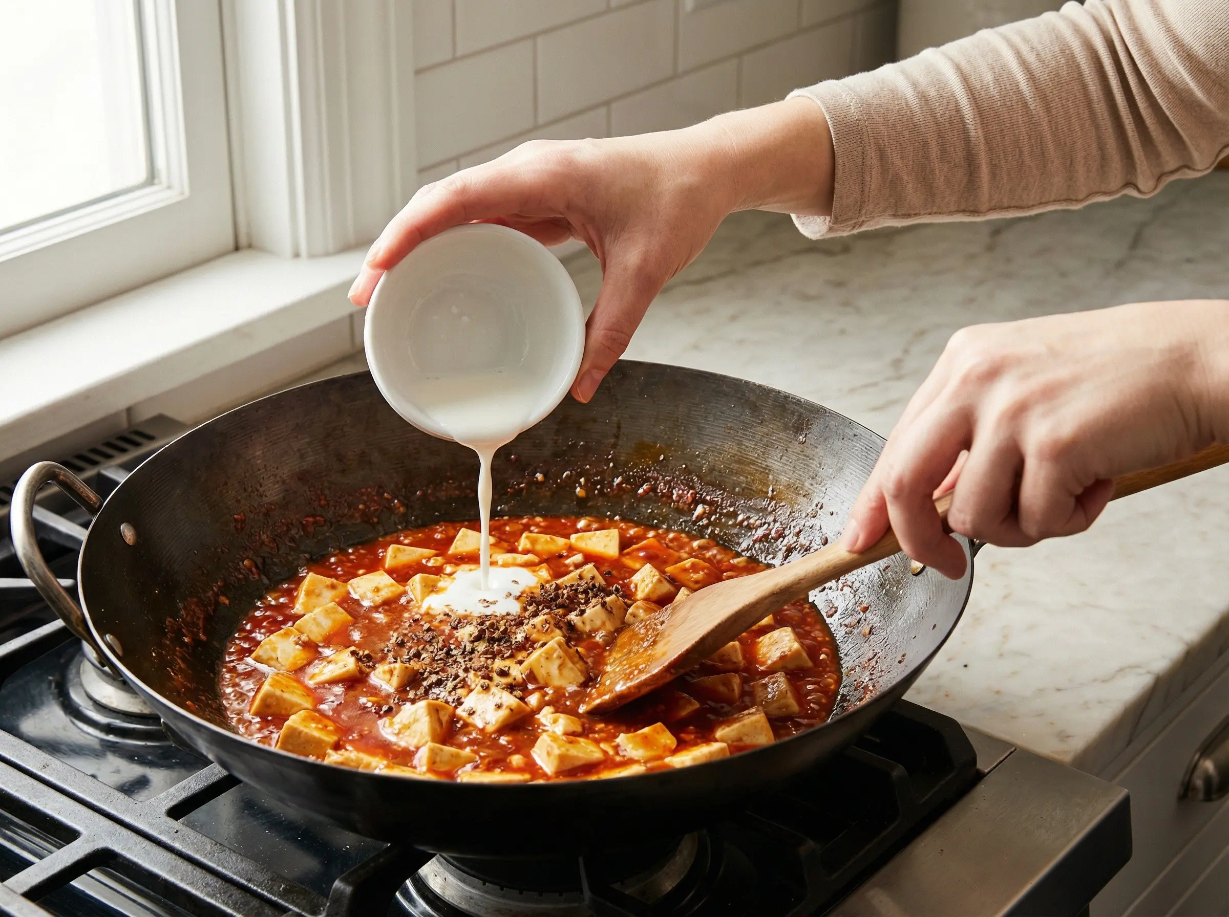 Give the cornstarch slurry a stir to recombine, then drizzle it into the wok while gently stirring. The sauce will thicken almost immediately into a glossy coating that clings to the tofu. Add half of the ground Sichuan peppercorn and gently fold to combine. The sauce should be thick enough to coat the tofu but still slightly fluid. If it becomes too thick, add a splash of broth or water.