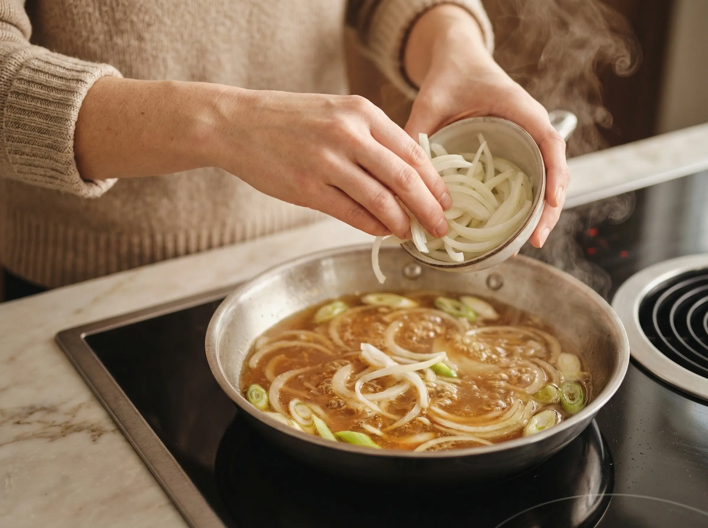 Oyakodon is traditionally made one portion at a time in a small lidded pan called an oyakodon nabe, but a small 8-inch skillet works well. Pour half of the broth mixture into the pan and bring to a simmer over medium heat. Add half of the sliced onions and the white parts of one sliced green onion. Simmer for 2-3 minutes until the onions are softened and translucent. The onions should be tender but not mushy, as they provide important texture to the final dish.