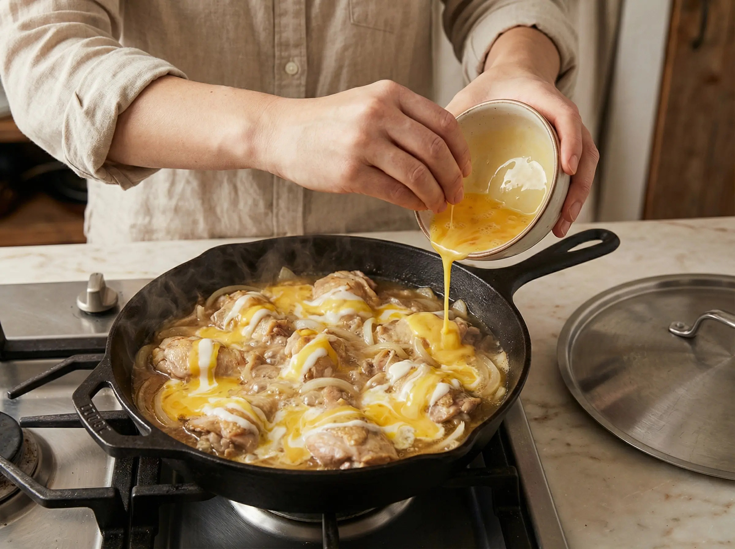 This is the crucial step that makes or breaks oyakodon. Give the beaten eggs a gentle stir, then pour about two-thirds of half the egg mixture (one portion) evenly over the chicken and onions in a circular motion. Cover the pan with a lid and cook for about 30 seconds. Remove the lid and drizzle the remaining one-third of the egg portion over the top. The eggs underneath should be mostly set while this final addition remains soft and silky. Cover again and cook for another 20-30 seconds. The eggs should be just barely set - still glossy, soft, and slightly runny in places. Remove from heat immediately. The residual heat will continue cooking the eggs, so it is better to undercook slightly than overcook.