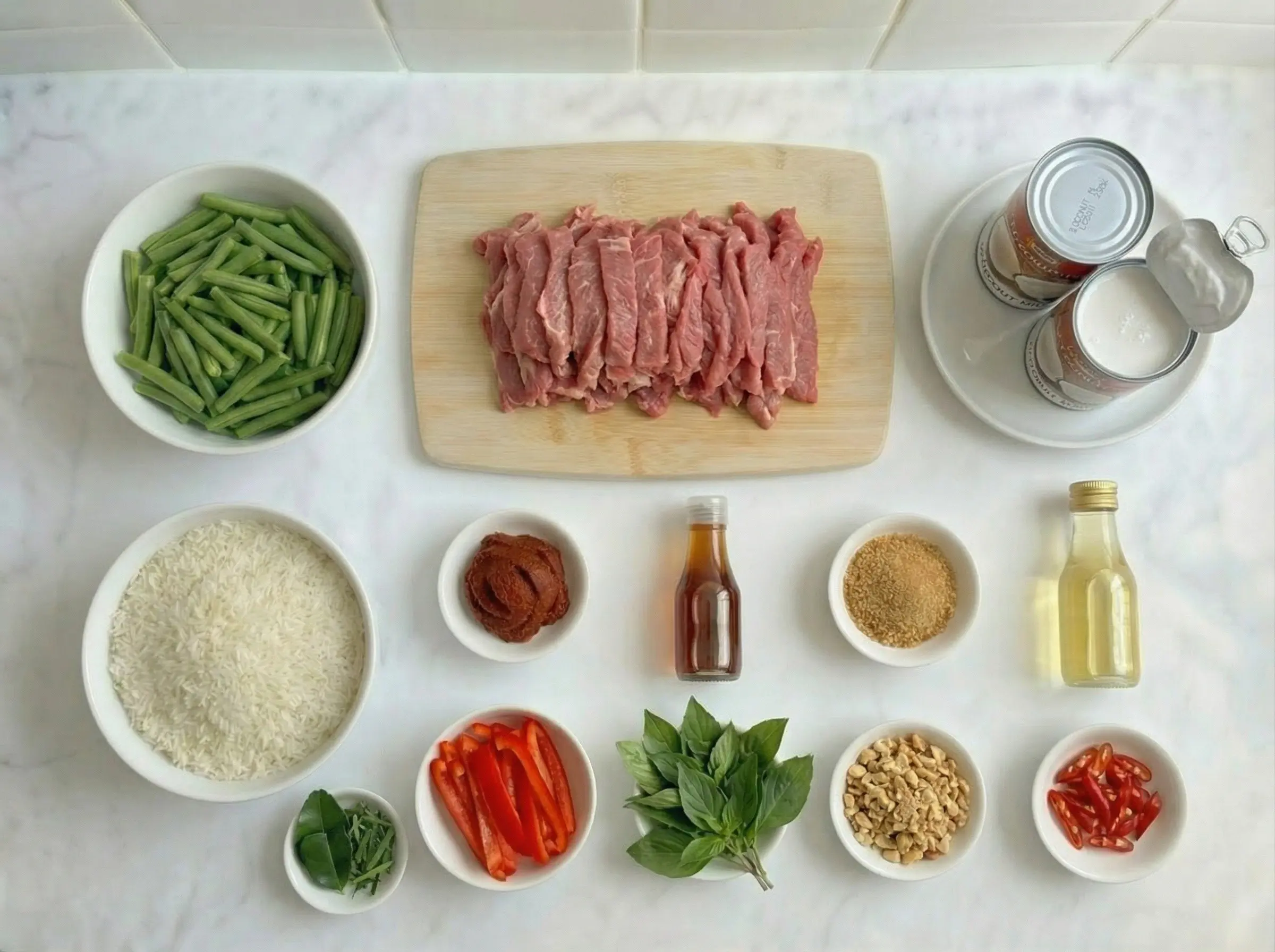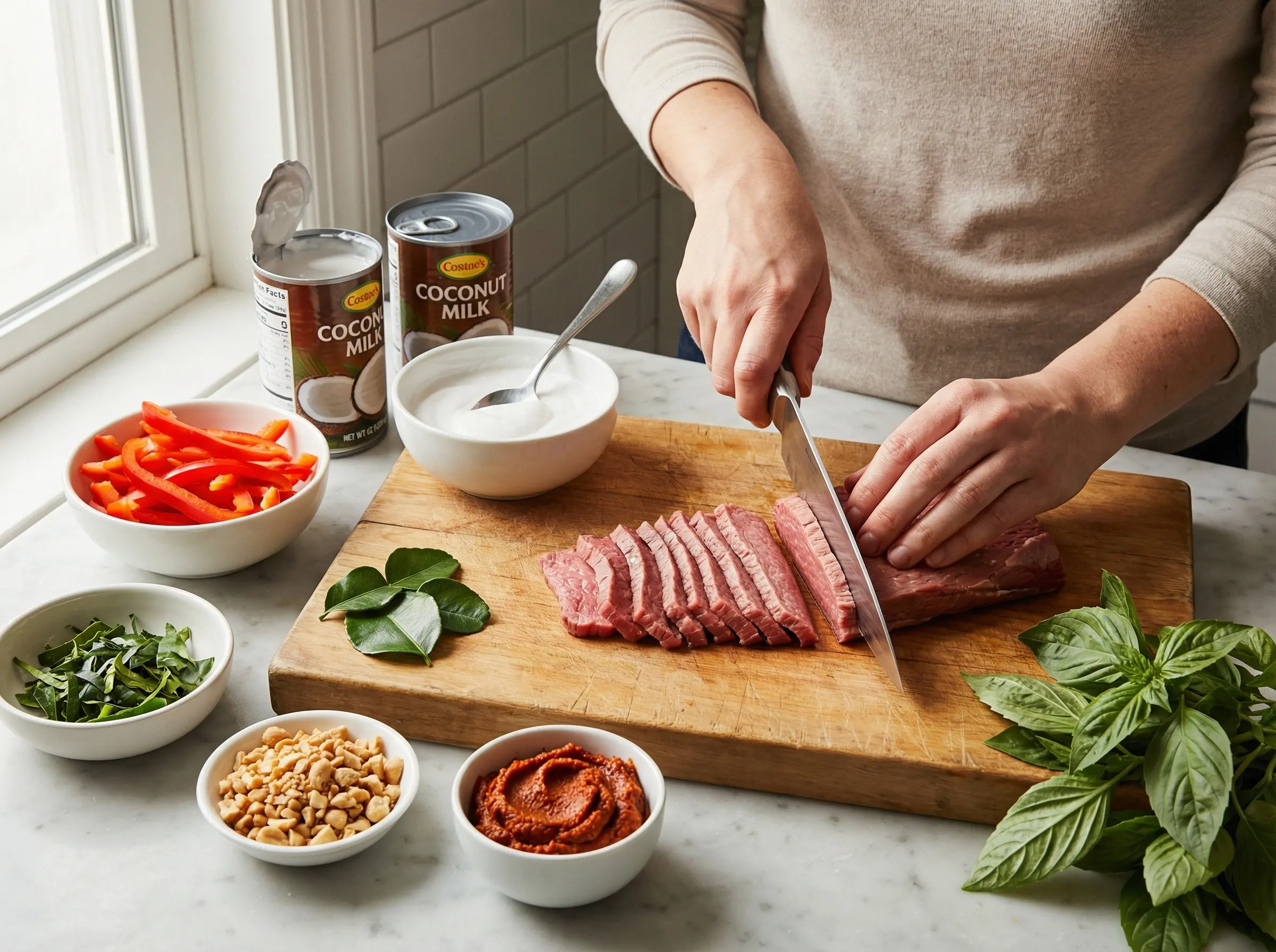 Prepare all ingredients before cooking. Slice the beef against the grain into thin strips, about 1/4 inch thick and 2 inches long - cutting against the grain ensures tender pieces. If the beef is slightly frozen, it will be easier to slice thinly. Slice the red bell pepper into thin strips. Remove the tough center stem from the kaffir lime leaves, stack them, roll tightly, and slice into very thin ribbons. Roughly crush the roasted peanuts with a knife or mortar and pestle - you want chunky pieces, not powder. Open the cans of coconut milk and do not shake them. Carefully scoop out the thick cream that has risen to the top and set it aside separately from the thinner milk - you will use these at different stages.