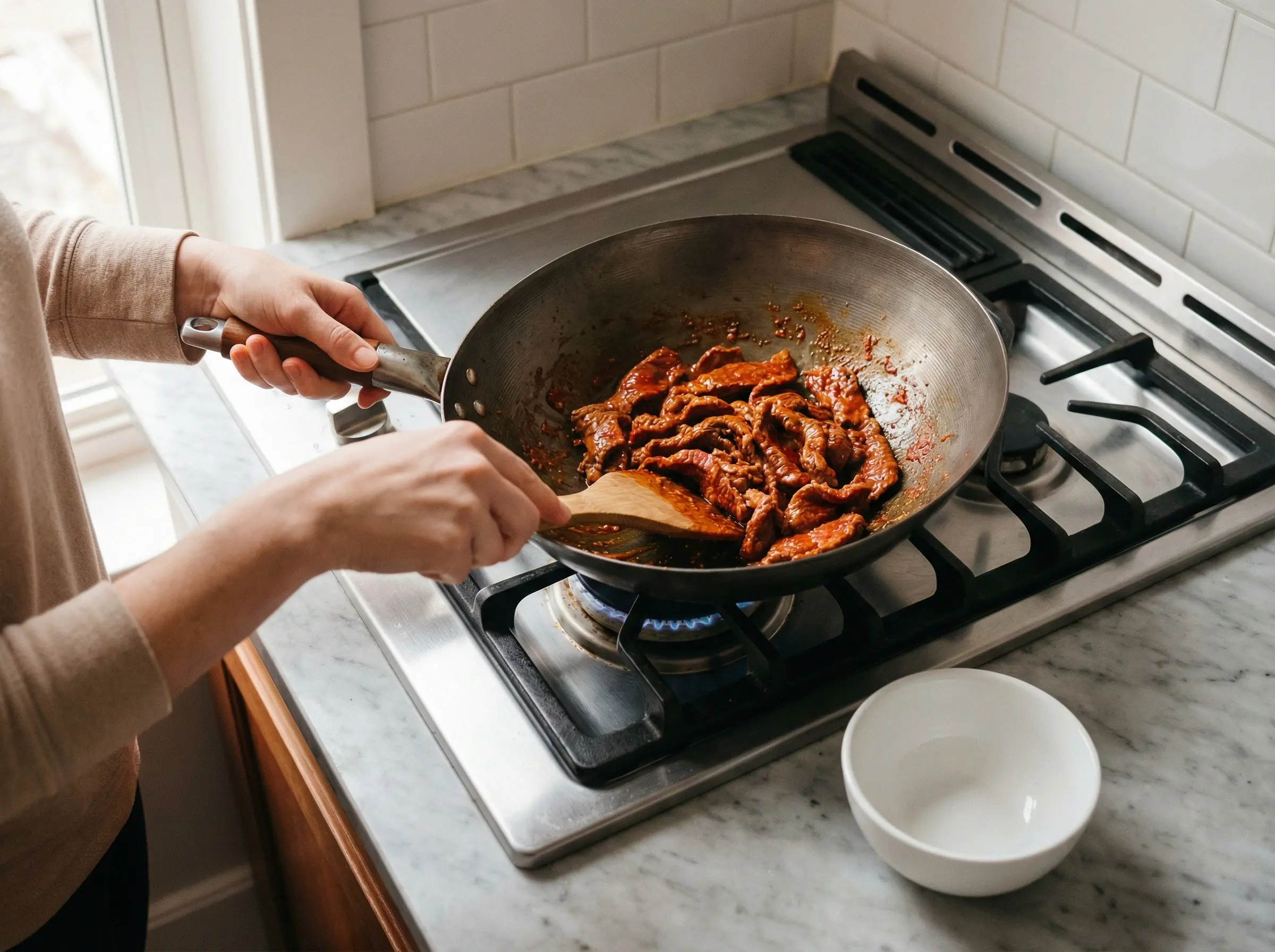 Add the sliced beef to the wok with the fried curry paste. Stir-fry for 2-3 minutes, tossing to coat each piece of beef evenly with the fragrant paste. The beef should be seared on the outside but can still be slightly pink inside at this stage - it will continue cooking in the sauce. The curry paste should coat the meat completely, giving it a vibrant red-orange color. If the paste begins to stick to the wok, add a splash of the thin coconut milk to help deglaze.