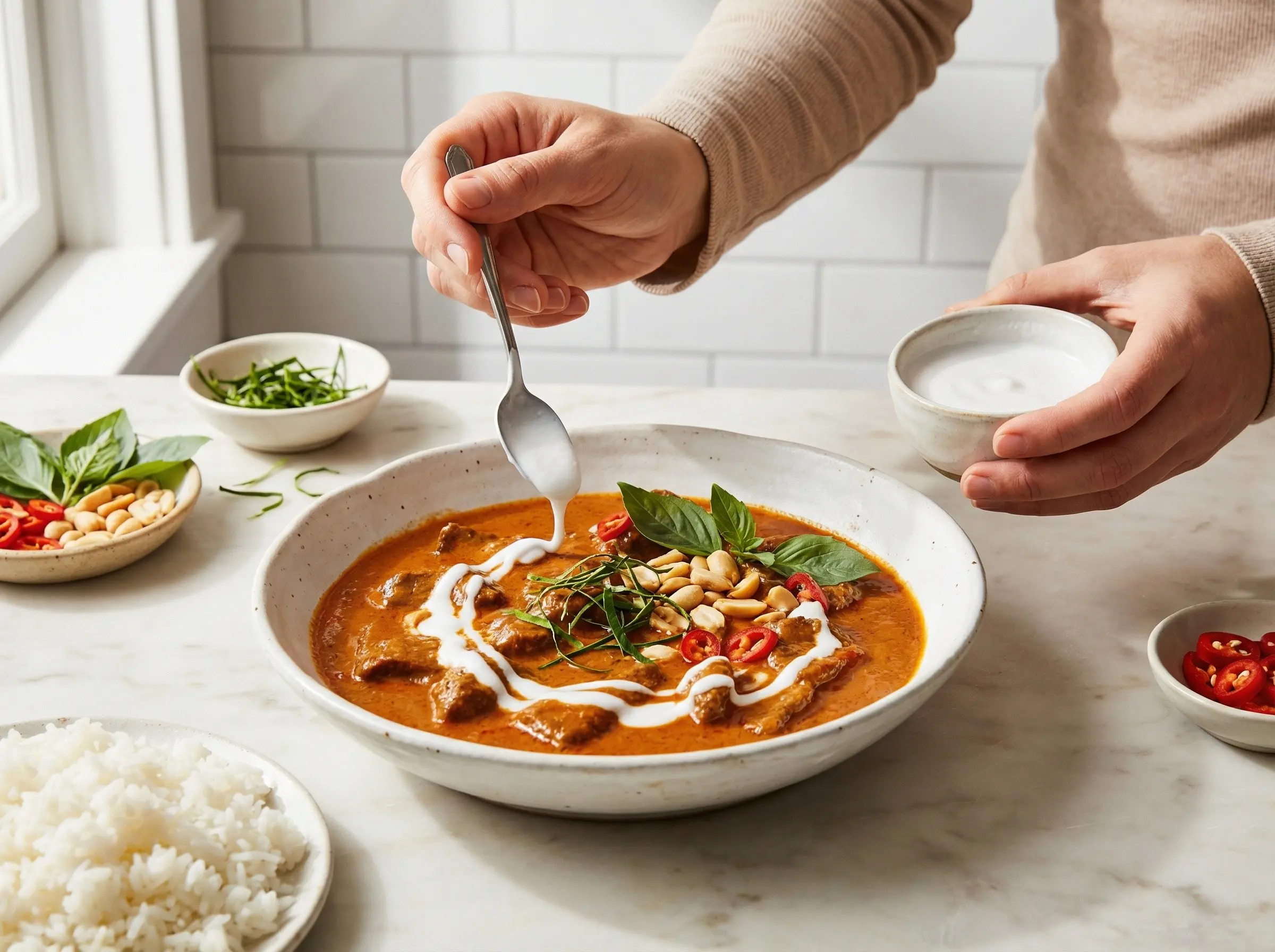 Transfer the curry to a serving bowl or plate. Drizzle the reserved thick coconut cream over the top in a decorative pattern - this is a traditional presentation that adds extra richness and visual appeal. Garnish with the remaining kaffir lime leaf ribbons, crushed roasted peanuts, sliced red chili, and fresh Thai basil leaves. The finished curry should be thick and glossy, deeply aromatic with the scent of kaffir lime and basil. Serve immediately with steamed jasmine rice. The thick consistency of panang curry makes it perfect for spooning over rice, with each grain soaking up the rich, fragrant sauce. Store leftovers refrigerated for up to 3-4 days - the flavors develop and improve overnight. Reheat gently, adding a splash of coconut milk if the sauce has thickened too much.