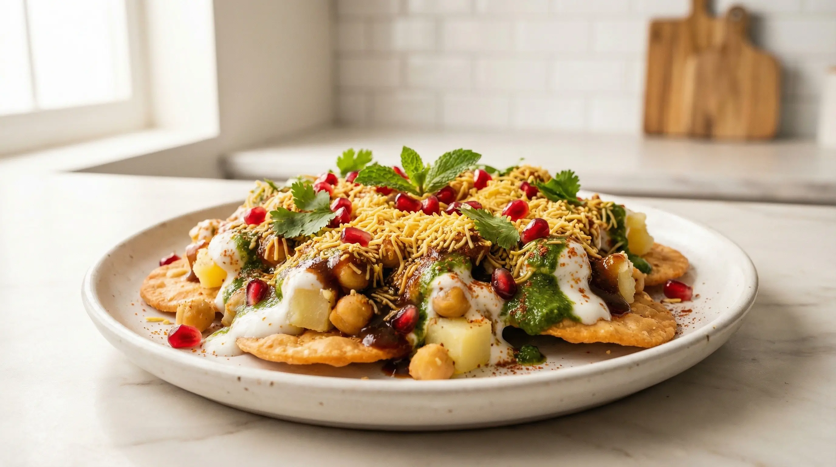 Papdi chaat is one of the crown jewels of Indian street food, a magnificent layered creation that showcases the genius of chaat - the category of savory snacks that defines Indian street cuisine. The dish takes its name from papdi (also spelled papri), the crispy fried flour wafers that form its crunchy foundation. Upon these golden crackers are layered boiled potatoes, chickpeas, cooling yogurt, tangy-sweet tamarind chutney, spicy green chutney, and a shower of spices and crunchy sev. The result is an edible symphony where every bite delivers crispy, creamy, tangy, spicy, and sweet notes in perfect harmony. Chaat as a culinary category has ancient roots in India, with the word derived from the Hindi verb "chaatna" meaning to lick - as in licking your fingers clean because the food is so delicious. The tradition of chaat is believed to have originated in the kitchens of Mughal emperors, where cooks created tangy, spiced snacks to stimulate appetite and aid digestion. Over centuries, chaat evolved from royal kitchens to the streets of North India, particularly in Delhi, Uttar Pradesh, and Punjab, where it became the domain of specialized vendors called chaat wallahs. Papdi chaat emerged as one of the most popular variations, beloved for its textural contrasts and the way it showcases all the essential chaat elements in one beautiful plate. What makes papdi chaat so extraordinary is its architectural approach to flavor. Each component serves a specific purpose: the papdi provide the essential crunch that persists even under the weight of toppings, the boiled potatoes and chickpeas add substance and earthiness, the whisked yogurt brings cooling creaminess that tempers the spices, the sweet tamarind chutney delivers deep fruity tanginess, the green chutney provides herbaceous heat, and the final flourishes of chaat masala, sev, and fresh cilantro tie everything together. The dish must be eaten immediately after assembly - within minutes, the papdi begin to soften and the magical textural contrast is lost. This urgency is part of the chaat experience, encouraging you to eat with abandon, chasing the perfect bite where crispy meets creamy meets tangy meets spicy.