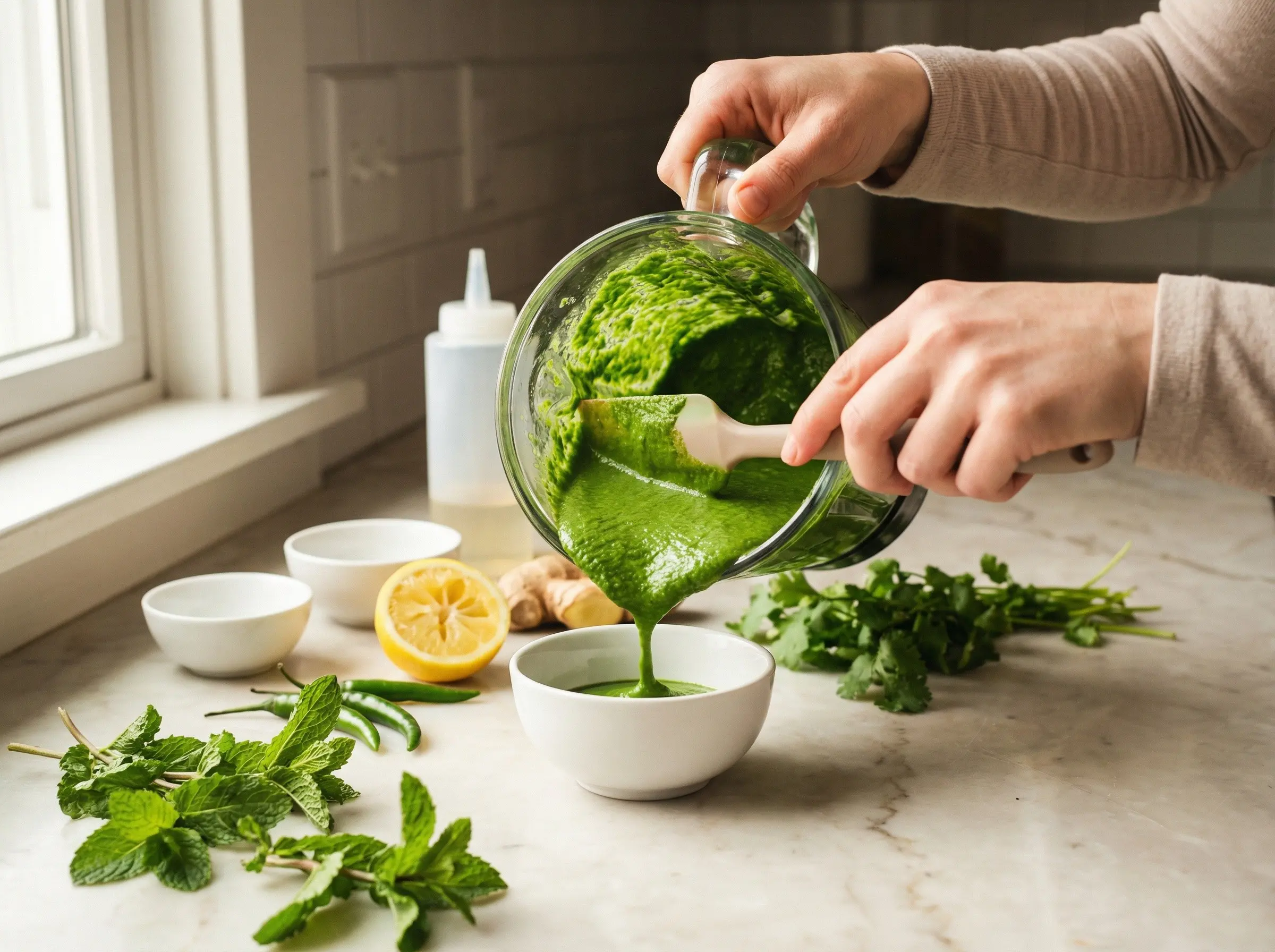 Prepare the green chutney if making from scratch. In a blender, combine 1 cup fresh mint leaves, 1 cup fresh cilantro, 2-3 green chilies, 1 inch ginger, 2 tablespoons lemon juice, 1/2 teaspoon salt, 1/2 teaspoon cumin, and 2-3 tablespoons water. Blend until completely smooth. The chutney should be vibrant green and pack a spicy, herbaceous punch. Taste and adjust salt and chili. Transfer to a squeeze bottle or bowl. Store-bought green chutney works well if you are short on time.