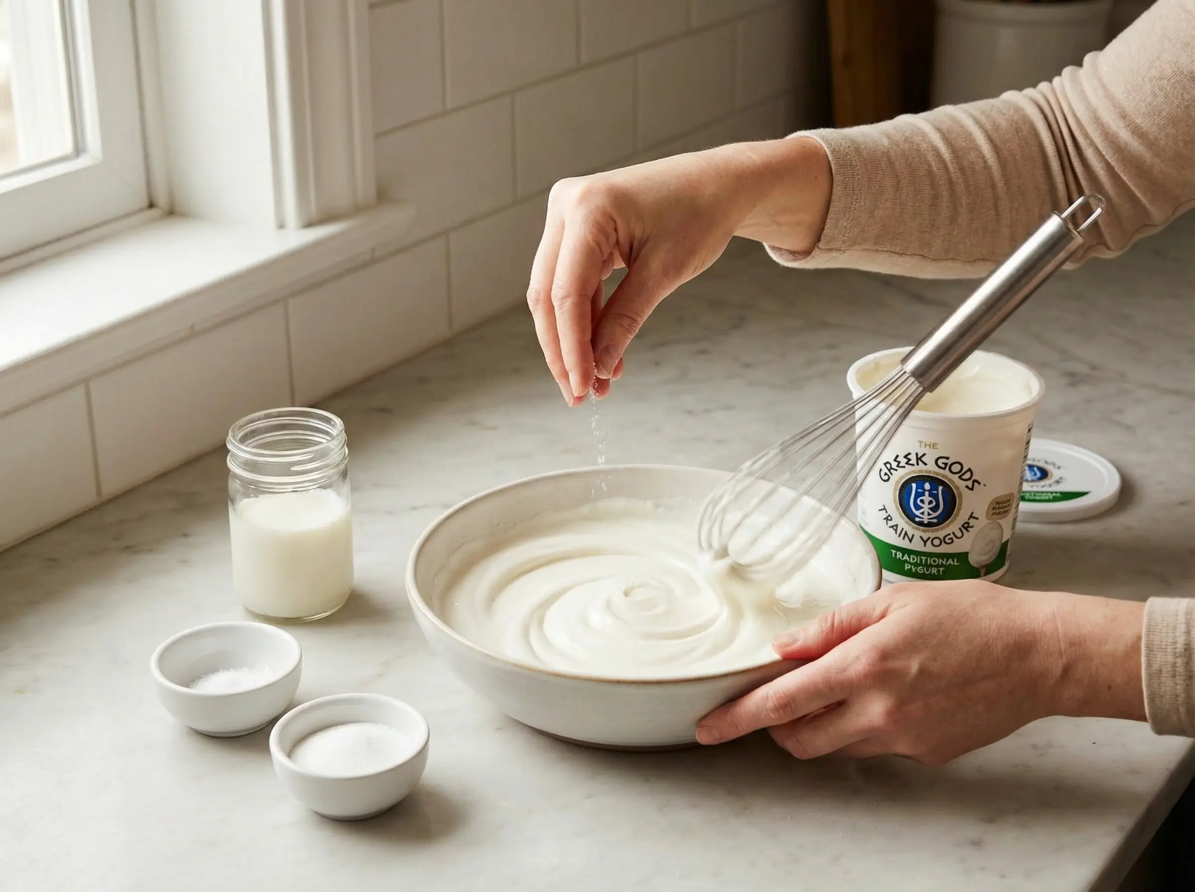 Prepare the yogurt. Use thick, full-fat yogurt for best results - Greek yogurt works well. Whisk the yogurt until completely smooth with no lumps. If the yogurt is too thick, add 1-2 tablespoons of water or milk to achieve a drizzling consistency. Season lightly with a pinch of salt and sugar to balance. The yogurt should be cool and creamy, providing a soothing contrast to the spices. Keep refrigerated until ready to assemble.