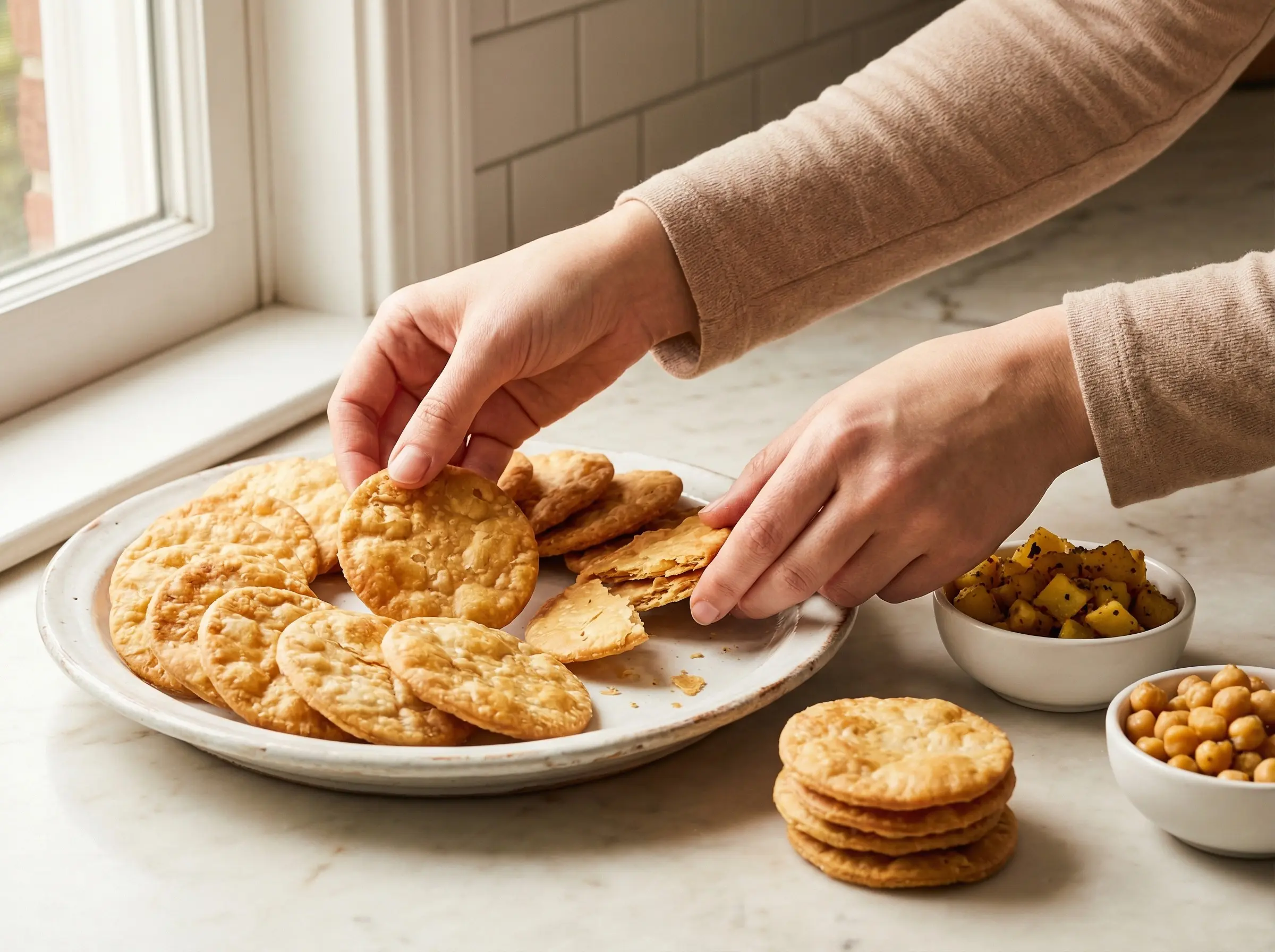 Assemble the papdi chaat just before serving - timing is crucial as the papdi will soften quickly. Arrange the papdi crackers in a single layer on a serving plate or in individual shallow bowls. For a more dramatic presentation, you can break some papdi into smaller pieces and leave others whole. Scatter the diced potatoes and chickpeas evenly over the papdi. If using diced onion, sprinkle it over the top.