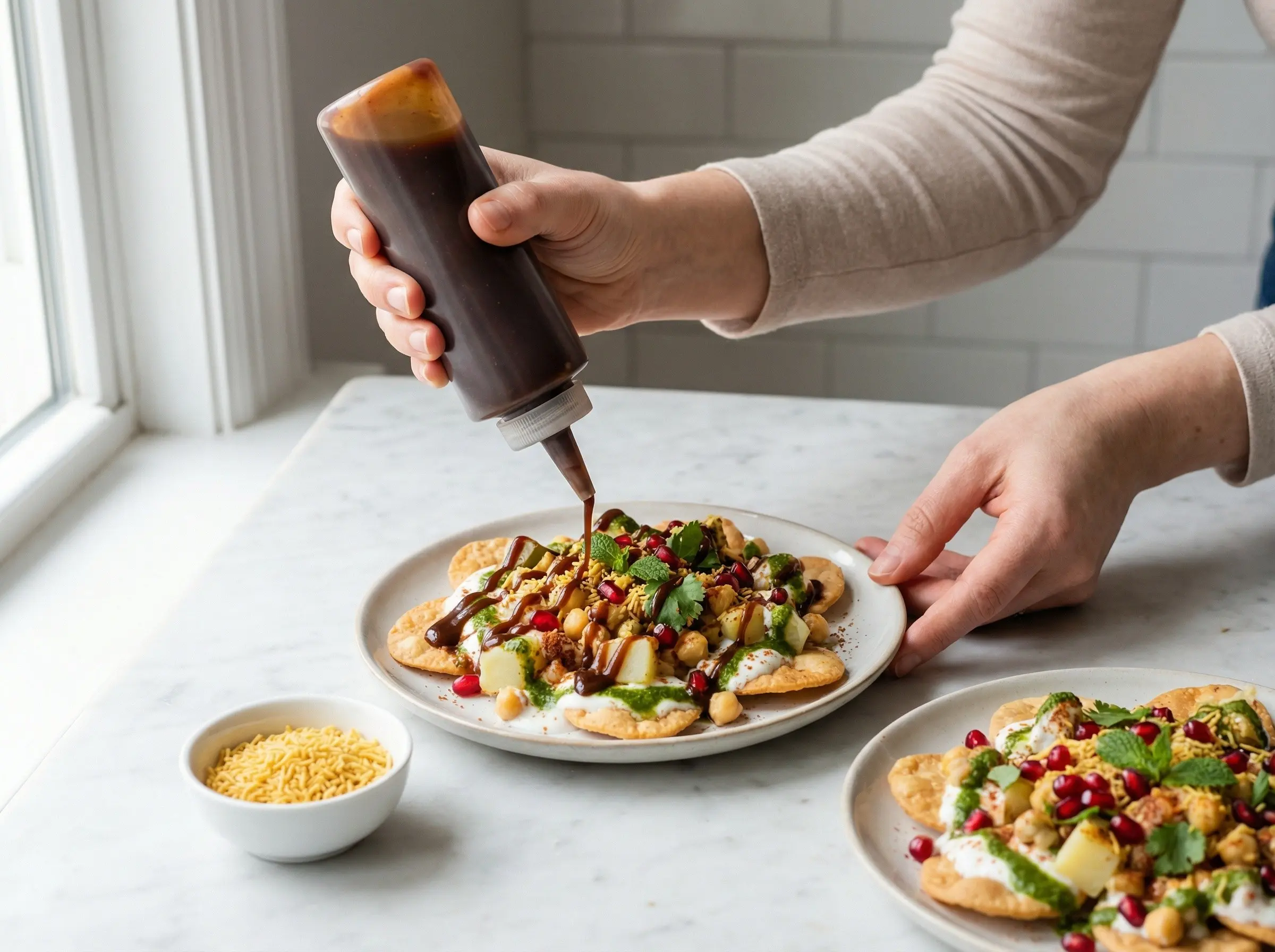 Add the toppings in the proper order for maximum impact. Drizzle the whisked yogurt generously over everything - it should pool in some areas and coat others. Next, drizzle the sweet tamarind chutney in artistic zigzags across the plate. Follow with the spicy green chutney, using less than the tamarind since it is more potent. Sprinkle chaat masala, roasted cumin powder, red chili powder, and black salt over everything. Top with a generous handful of fine sev for crucial crunch, pomegranate seeds for jewel-like bursts of sweetness, and fresh cilantro and mint leaves for color and freshness. Serve immediately - within 2-3 minutes the papdi will begin to soften. Eat with a spoon, making sure each bite includes papdi, filling, yogurt, both chutneys, and sev. The magic of papdi chaat is experiencing all the contrasting flavors and textures in every mouthful.