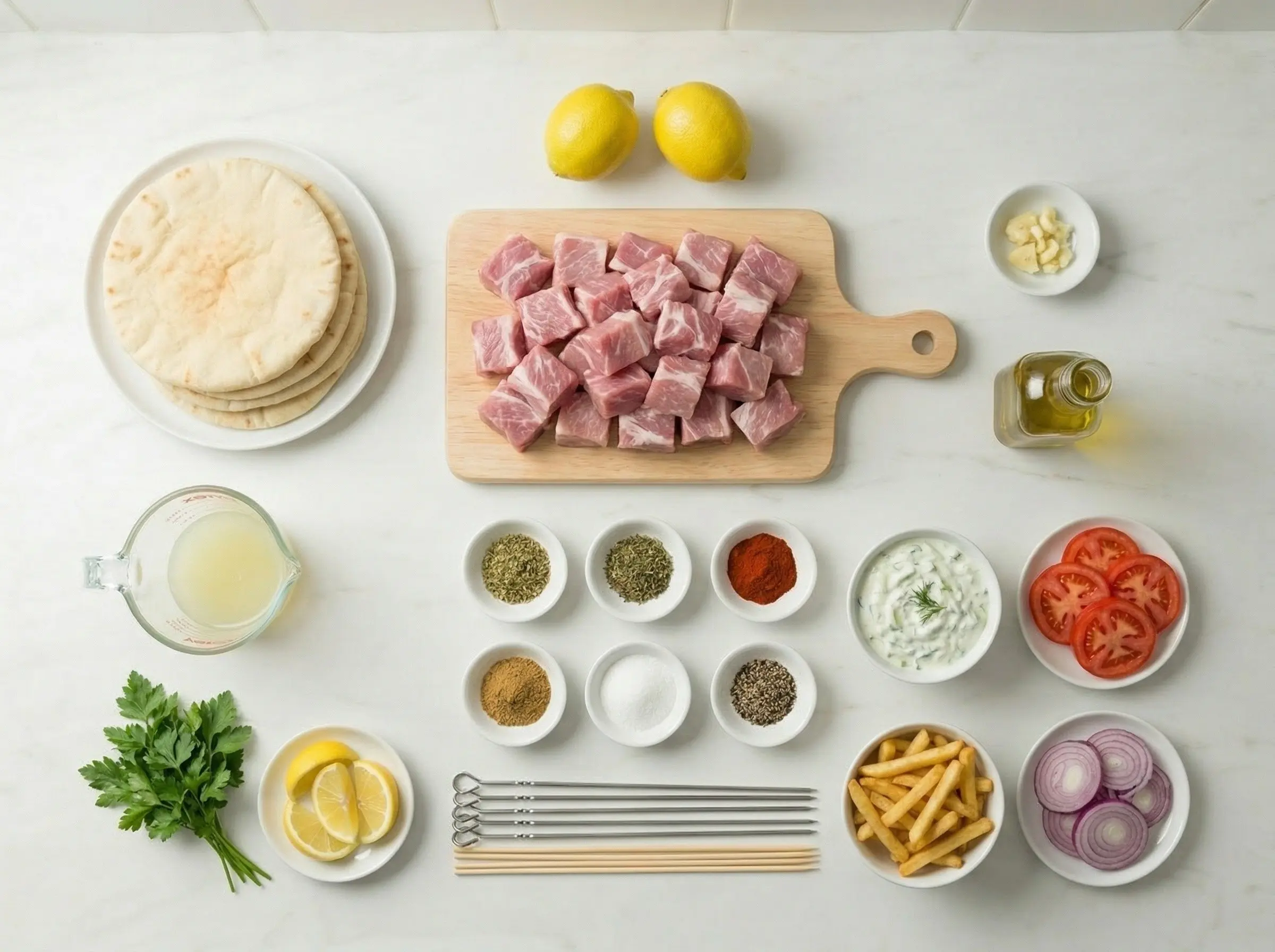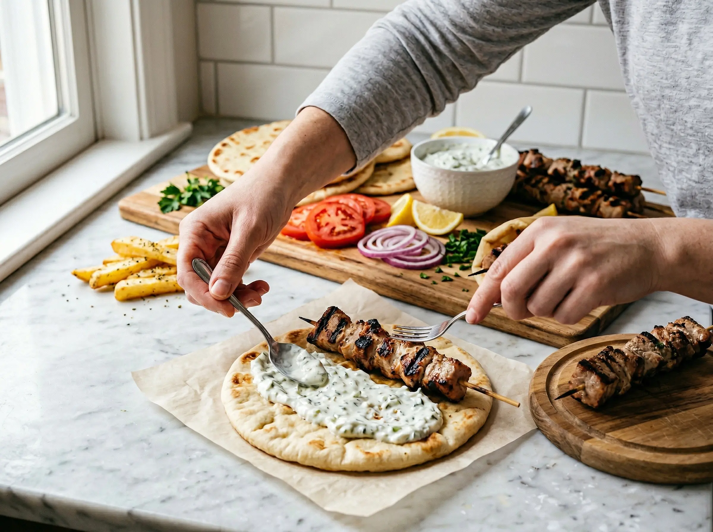 Assemble and serve. Slide the grilled pork off the skewers onto a serving platter. Serve family-style with warm pita bread, tzatziki, sliced tomatoes, sliced red onion, and lemon wedges, allowing everyone to build their own wraps. To assemble a souvlaki wrap: lay a warm pita flat, spread tzatziki down the center, add several pieces of pork, top with tomatoes and onion, and optionally add a handful of hot french fries (the Thessaloniki way). Roll up the bottom third and fold in the sides to create a cone shape, wrapping in parchment paper for easier eating. Squeeze fresh lemon juice over the meat before wrapping for brightness. Serve immediately while the meat is hot and the pita is warm. Souvlaki is perfect street food - eaten standing, walking, or gathered around a table with friends, cold drinks, and good conversation. Leftover grilled pork can be refrigerated and reheated for salads, rice bowls, or quick wraps.