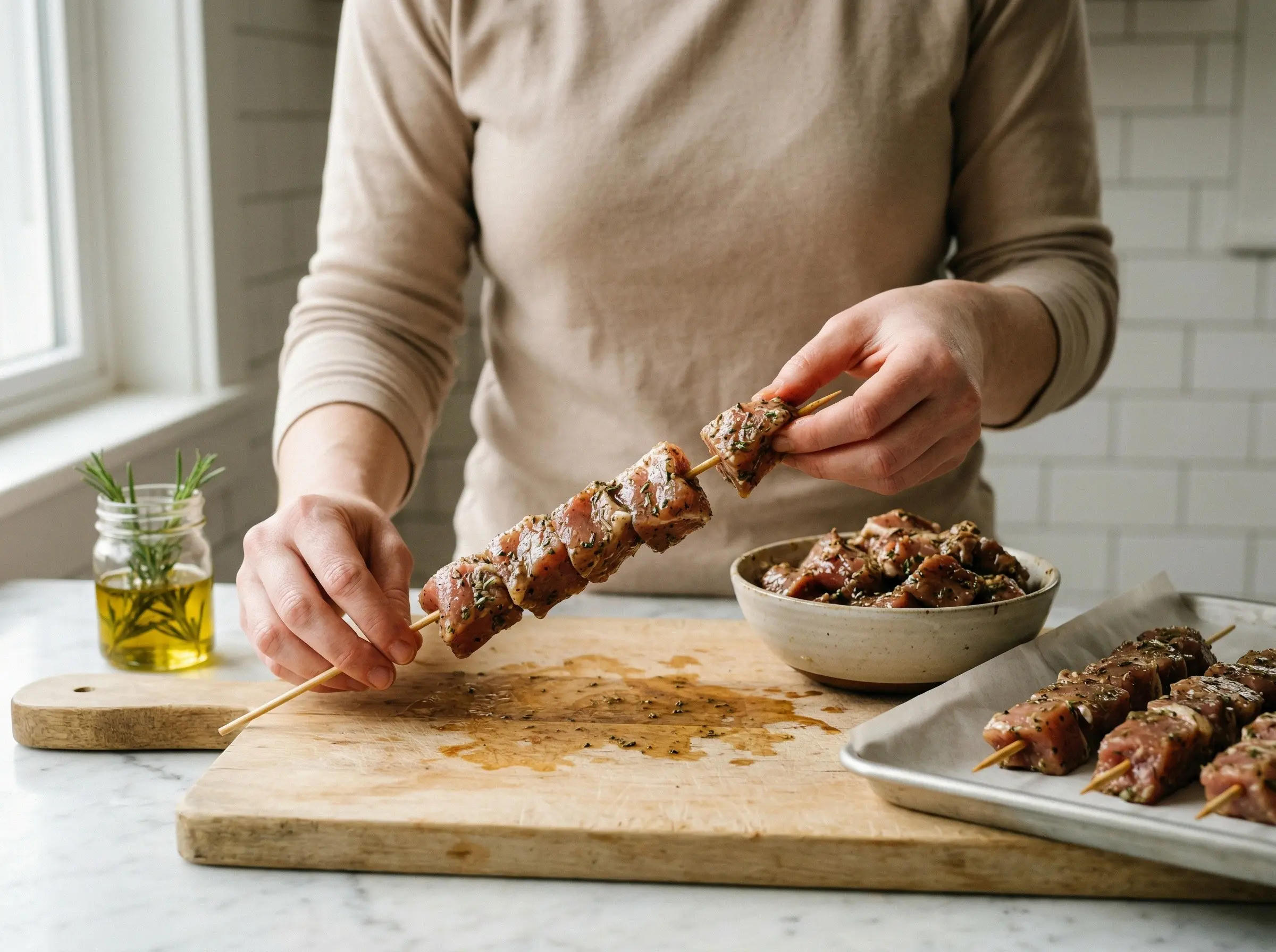 Thread the meat onto skewers. Remove the pork from the marinade, shaking off excess but not wiping dry. Thread 5-6 pieces onto each skewer, leaving a small space between pieces to ensure even cooking. Do not pack the meat too tightly or the centers will not cook through. If some pieces have more fat, distribute them evenly among the skewers for consistent flavor.