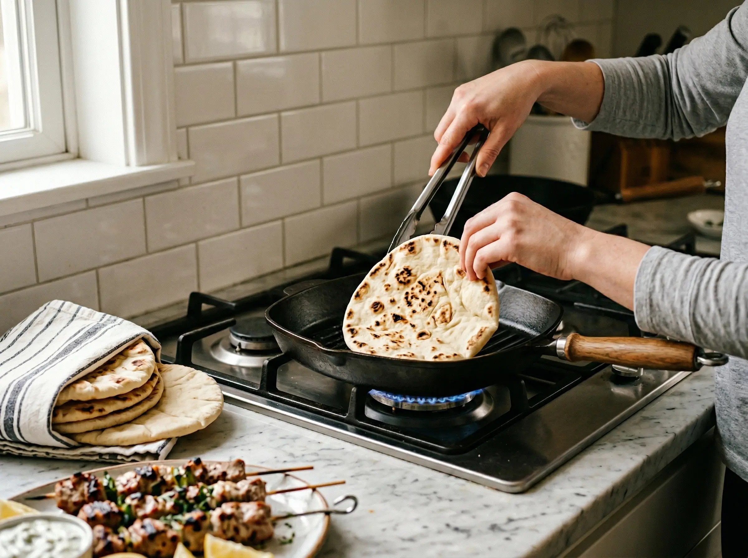 Warm the pita bread. While the meat rests, briefly warm the pita breads on the grill for 30 seconds to 1 minute per side until soft and pliable with light char marks. Alternatively, wrap in foil and warm in a 350 degree F oven for 5 minutes, or heat in a dry skillet. The pita should be soft enough to wrap without cracking. Keep warm wrapped in a clean kitchen towel.
