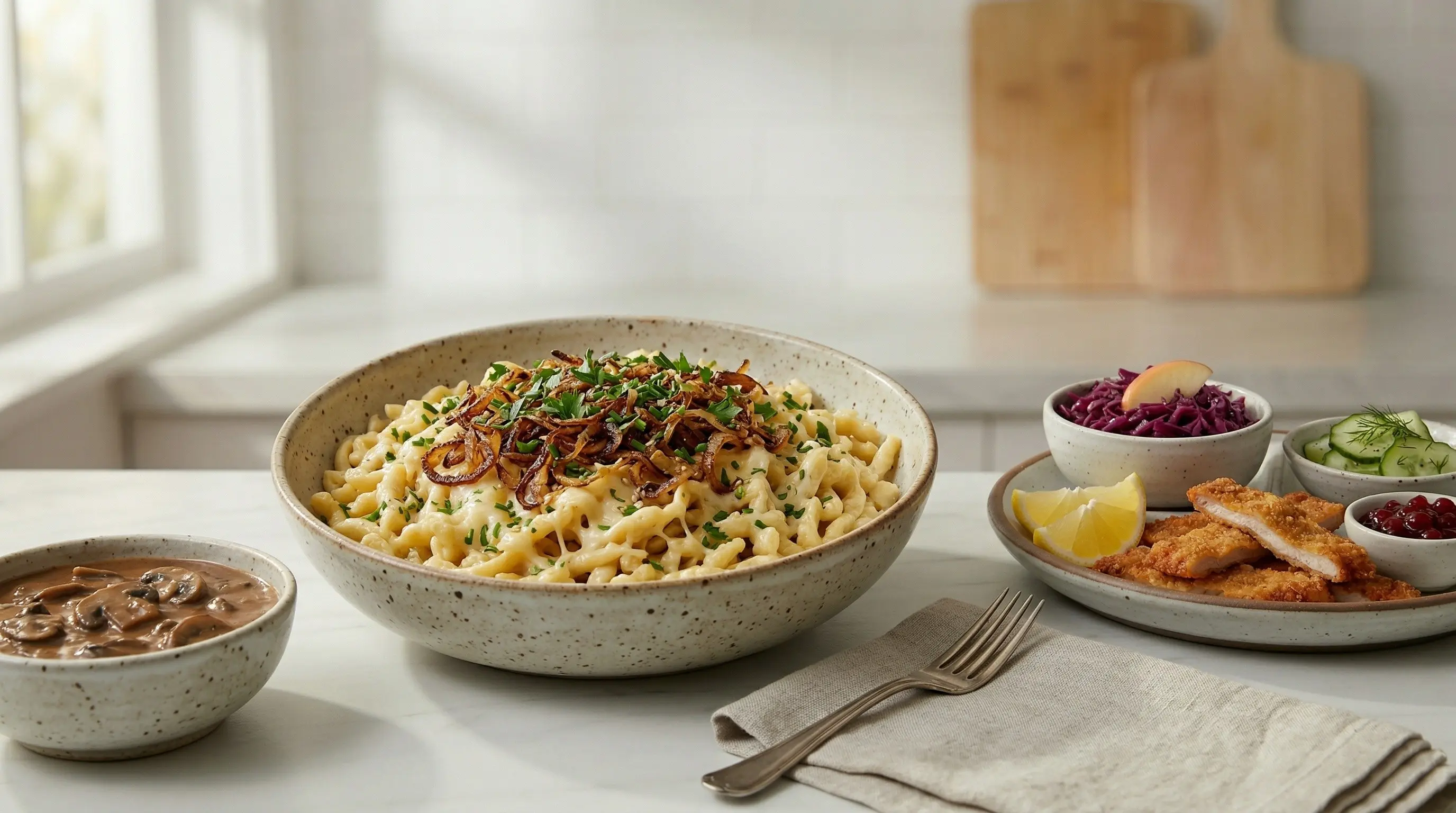 Spaetzle are the quintessential comfort food of southern Germany, Austria, and Switzerland - small, irregularly shaped egg noodle dumplings that have been nourishing families in the Swabian region for centuries. The name comes from the Swabian dialect word "Spatzen," meaning "little sparrows," referring to the small, elongated shape of the dumplings that supposedly resemble the birds. While the exact origins are lost to history, spaetzle have been documented in recipes since at least the 18th century and were likely made in home kitchens long before that. They represent the ingenious peasant cooking of the region, transforming simple pantry staples - flour, eggs, salt, and water - into something deeply satisfying. Spaetzle hold a special place in the culinary identity of Swabia, the southwestern region of Germany that includes Stuttgart and much of Baden-Wurttemberg. The dish is so central to Swabian culture that the people of the region are affectionately nicknamed "Schwabenspatzen" (Swabian sparrows). Every Swabian grandmother has her own recipe, fiercely guarded and passed down through generations, with subtle variations in the ratio of eggs to flour, the addition of nutmeg or herbs, and the technique used to form the dumplings. Traditional methods include scraping the batter from a wooden board into boiling water, pressing it through a special spaetzle press, or using a spaetzle hobel (a flat board with holes that the batter is scraped across). What makes spaetzle so beloved is their unique texture and incredible versatility. Unlike dried pasta, spaetzle have a tender, slightly chewy bite with an eggy richness that absorbs sauces and gravies beautifully. Their irregular shapes create pockets that catch melted butter, cheese, and braising liquids. Spaetzle are the traditional accompaniment to countless German and Austrian dishes: beef rouladen with rich gravy, jaegerschnitzel with mushroom sauce, goulash, and sauerbraten. They can also be transformed into main dishes like kasespaetzle (the German answer to mac and cheese, with caramelized onions and melted cheese) or fried until crispy in butter. Freshly made spaetzle, tossed with brown butter and fresh herbs, is a revelation - proof that the humblest ingredients, prepared with care and tradition, can create something extraordinary.