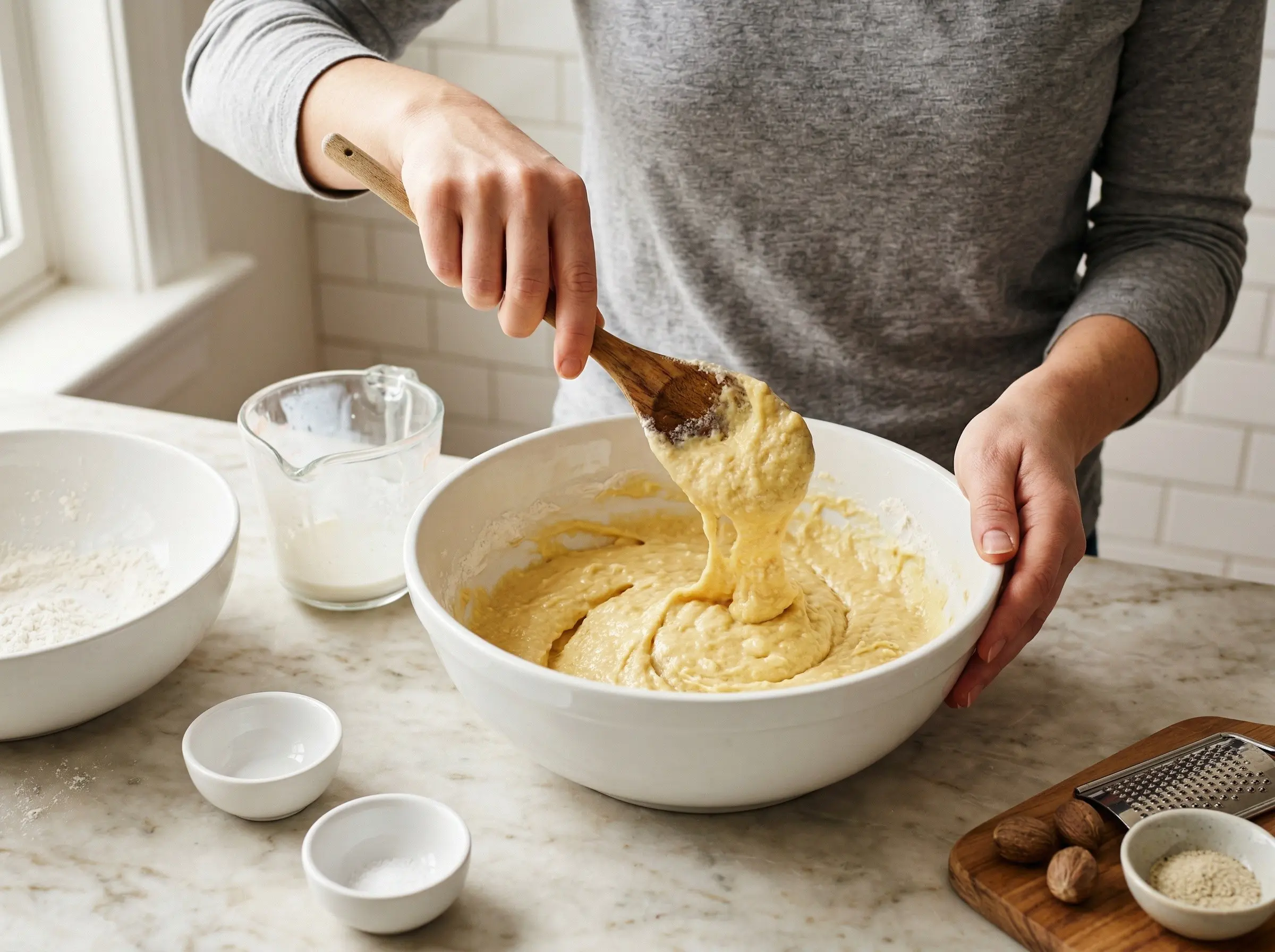 Make the batter. In a large bowl, whisk together the flour, salt, nutmeg, and white pepper. Make a well in the center. In a separate bowl, beat the eggs with the milk (or water - milk makes slightly richer spaetzle, water makes them lighter). Pour the wet ingredients into the well and stir vigorously with a wooden spoon until a thick, sticky batter forms. The batter should be smooth with no lumps, thick enough to slowly drop from a spoon but not so thick it holds its shape. Adjust with more flour or liquid as needed. Let the batter rest for 15-30 minutes - this allows the gluten to relax and produces more tender spaetzle.