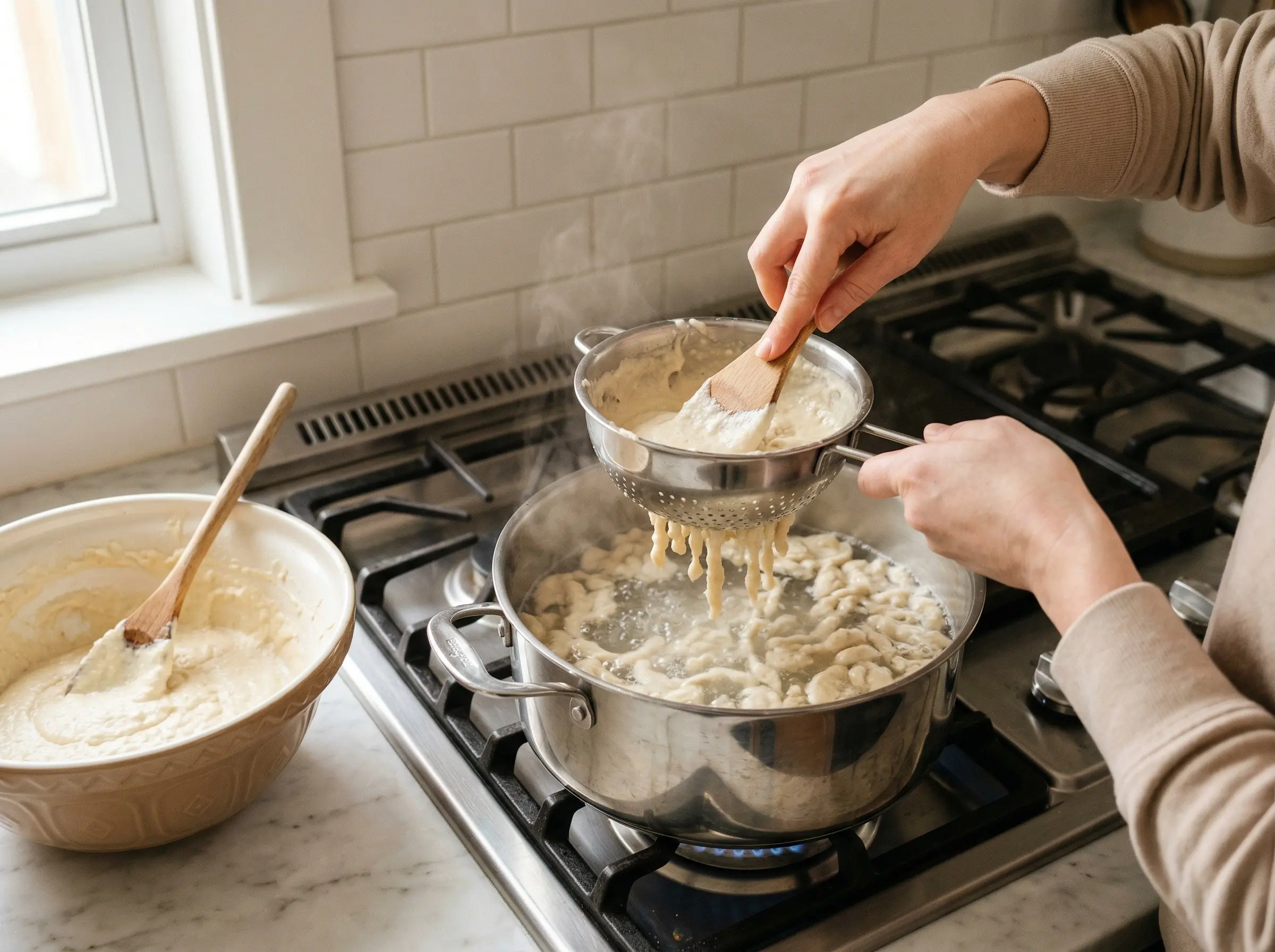 Form and cook the spaetzle using your preferred method. The traditional spaetzle press or hobel works best, pushing the batter through holes directly into the water. Alternatively, use a colander or flat grater with large holes - place it over the pot and press the batter through with a spatula or the back of a spoon. For the board-scraping method, spread batter on a wet cutting board, hold it at an angle over the water, and use a knife or bench scraper to cut small strips of batter into the boiling water. Work in batches to avoid overcrowding.