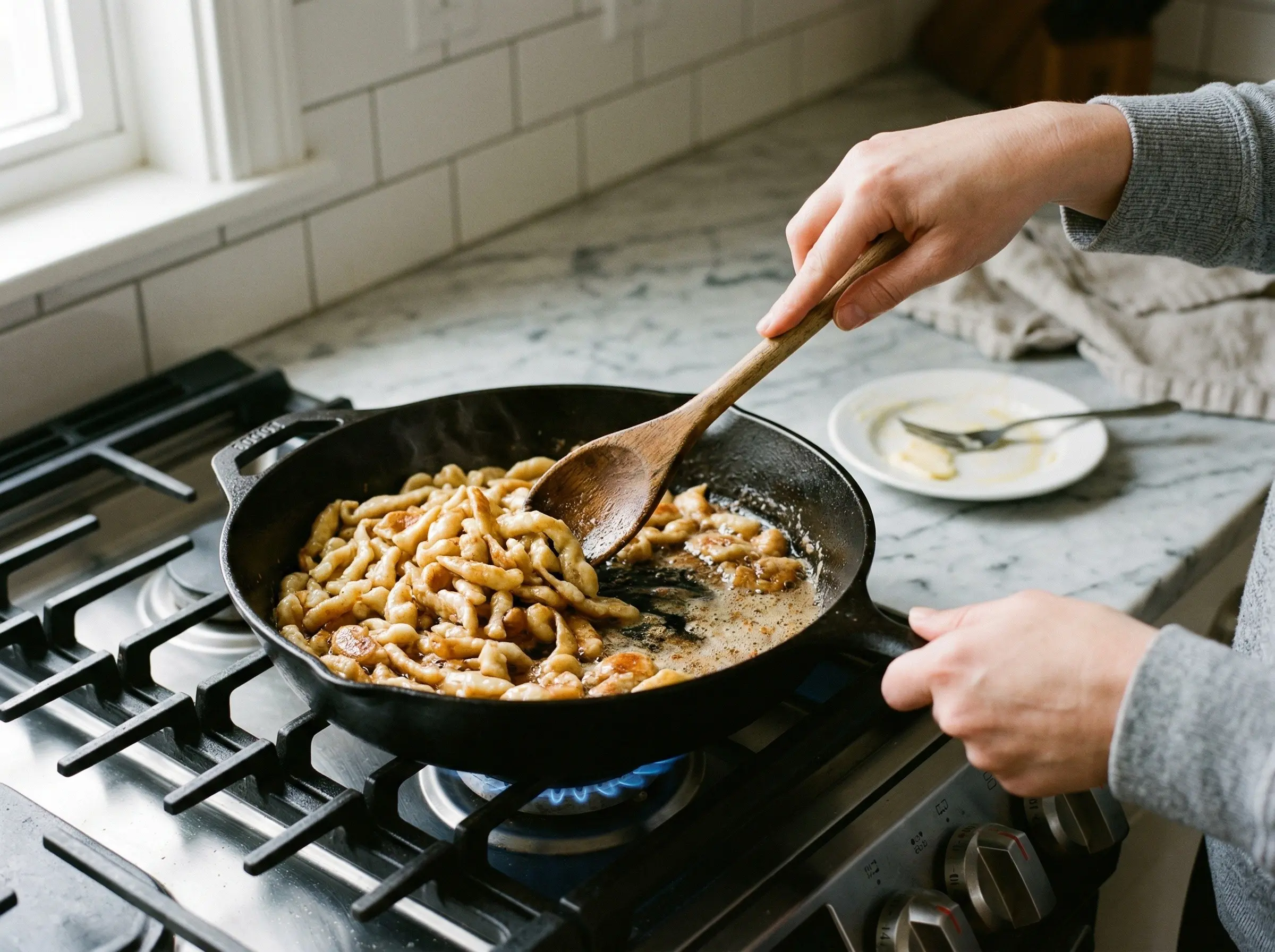 Finish with brown butter for classic preparation. In a large skillet, melt the butter over medium heat. Continue cooking, swirling occasionally, until the butter turns golden brown and smells nutty - about 3-4 minutes. Watch carefully as it can burn quickly. Add the drained spaetzle to the brown butter and toss to coat. Season with additional salt if needed. The spaetzle can also be cooked in the butter for a few extra minutes until lightly golden and slightly crispy on the edges - this adds wonderful texture.