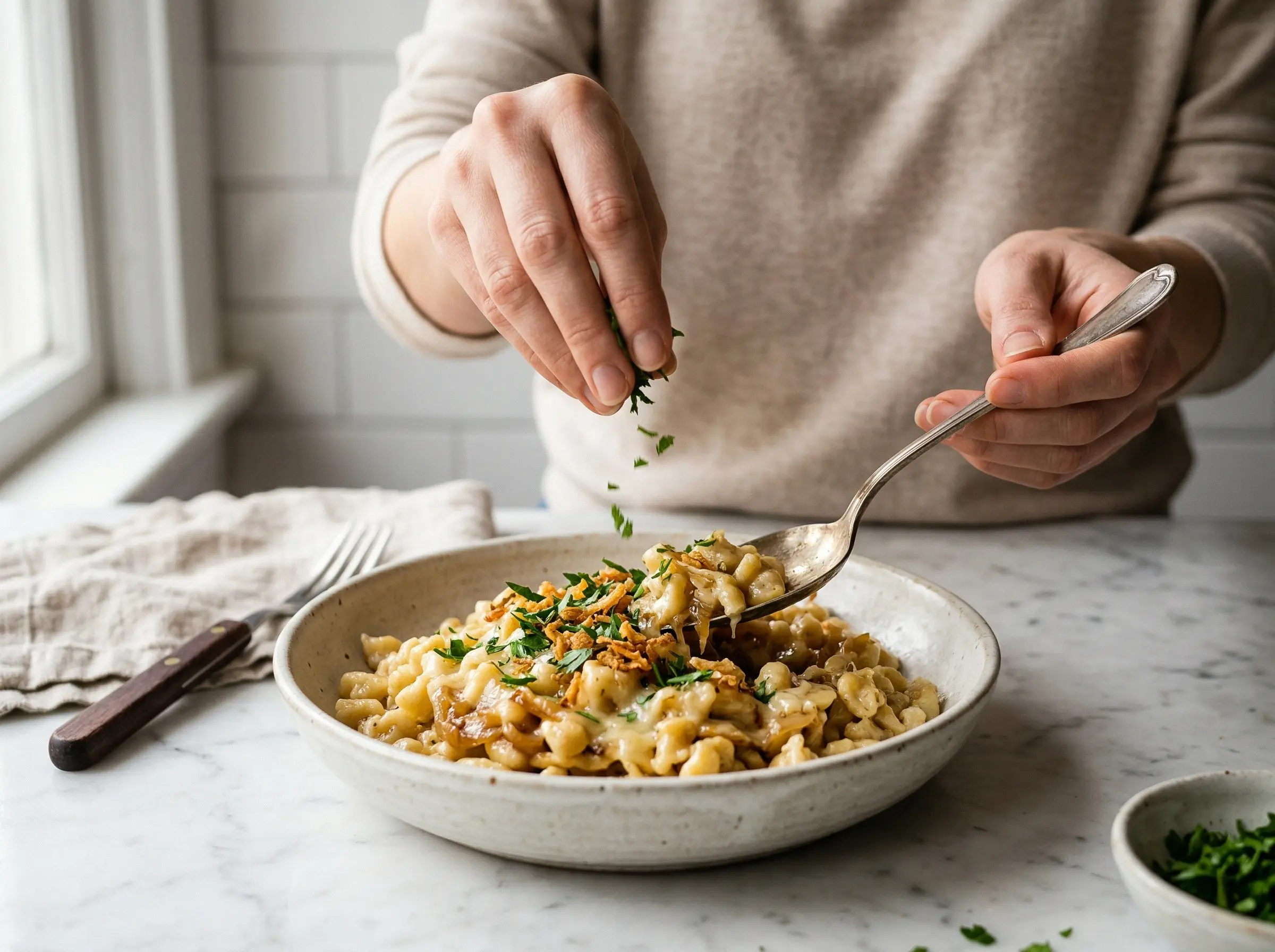 Serve immediately. Transfer the buttered spaetzle to a warm serving dish and garnish with freshly chopped parsley or chives. For kasespaetzle (cheese spaetzle), layer the warm spaetzle with shredded Gruyere or Emmentaler cheese and caramelized onions, then broil until the cheese is melted and bubbly. For a simple presentation, top with crispy fried onions. Spaetzle are the perfect accompaniment to dishes with rich gravies and sauces - serve alongside beef stroganoff, goulash, schnitzel, sauerbraten, or any braised meat. The tender dumplings soak up sauces beautifully while providing satisfying, chewy texture. Leftover spaetzle can be refrigerated for up to 3 days and reheated by sauteing in butter until warmed through and slightly crispy - many people prefer them this way.
