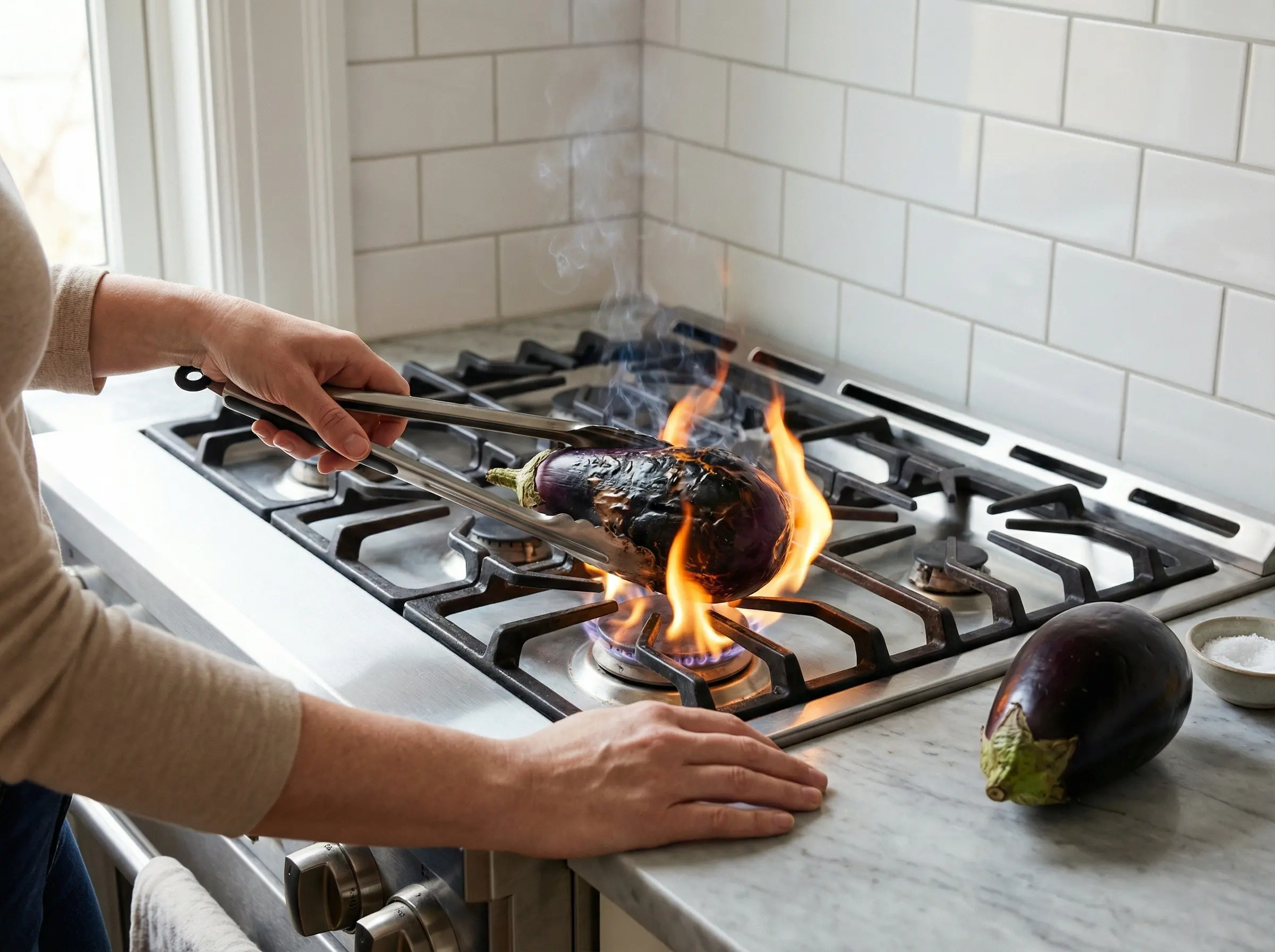 Start by cooking the eggplants, which can be done in several ways depending on your preference and equipment. For the most authentic smoky flavor, char the whole eggplants directly over a gas flame, turning them with tongs every few minutes until the skin is blackened and blistered all over and the flesh is completely soft, about 15-20 minutes. Alternatively, you can broil them in the oven, placing them on a baking sheet 4 inches from the broiler and turning occasionally until charred and soft. Another option is to roast them whole at 450 degrees F for 30-40 minutes until collapsed and very soft. The charring method gives the most authentic smoky flavor that is characteristic of zaalouk. Once cooked, place the hot eggplants in a bowl and cover with plastic wrap or a lid. Let them steam for 10-15 minutes - this makes the skin much easier to peel.