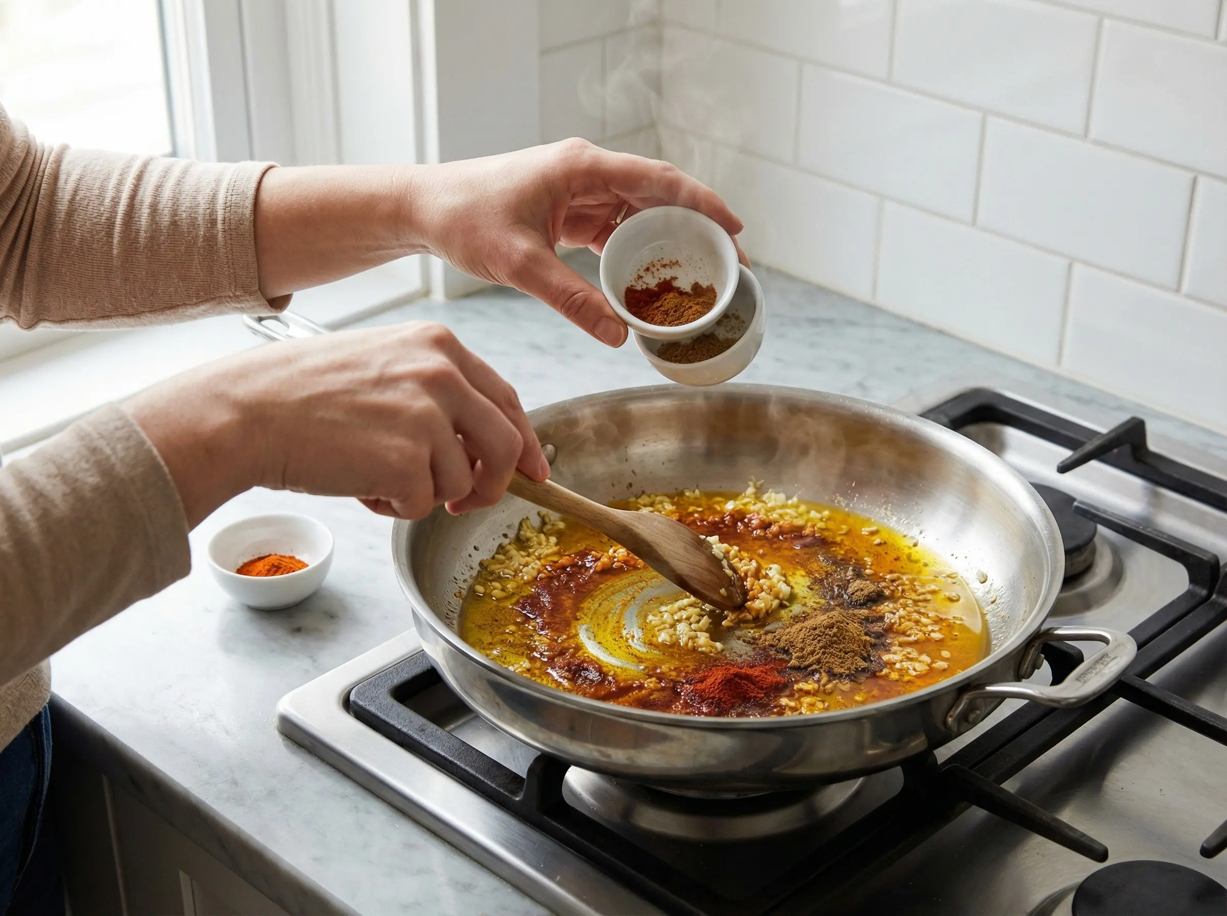 Heat the olive oil in a large, deep skillet or sauté pan over medium heat. Add the minced garlic and cook for about 1 minute, stirring constantly, until fragrant but not browned. Garlic burns easily so watch it carefully. Add the ground cumin, paprika, and cayenne pepper to the oil. Stir constantly for about 30 seconds to bloom the spices in the oil - this releases their essential oils and creates deeper, more complex flavors. The kitchen should smell wonderfully aromatic at this point. Be careful not to let the spices burn as they can become bitter.