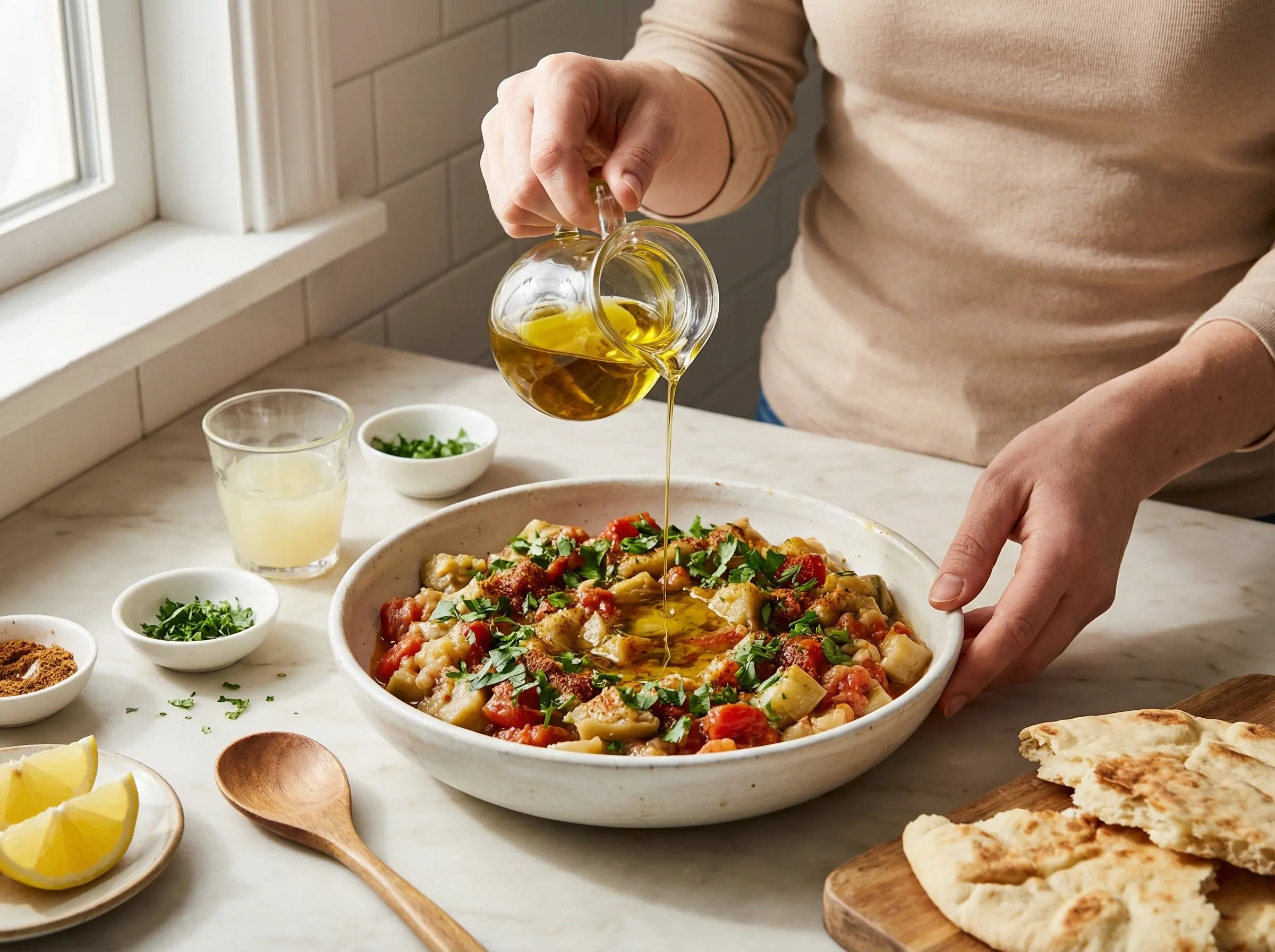 Remove the pan from heat and stir in the fresh lemon juice, chopped cilantro, and parsley. The fresh herbs and lemon juice are added at the end to preserve their bright, fresh flavors. Taste and adjust seasoning - you might want more salt, more lemon for brightness, more cumin for earthiness, or more cayenne for heat. Transfer the zaalouk to a serving bowl and let it cool to room temperature. Traditional zaalouk is served at room temperature or even slightly chilled, not hot. Drizzle with additional olive oil before serving - this is important for both flavor and presentation. The oil should pool slightly on top. Garnish with a few fresh cilantro leaves. Serve with warm bread for scooping, as part of a mezze spread, or as a side dish to grilled meats or tagines. Zaalouk keeps well in the refrigerator for up to 5 days and the flavors improve over time. Always bring to room temperature and add a fresh drizzle of olive oil before serving.